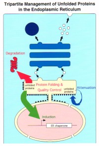 Unfolding or misfolding of proteins constitutes a fundamental threat to all living cells. In eukaryotes, proteins can be unfolded or misfolded in a variety of subcellular compartments such as cytoplasm, mitochondria, and peroxisomes, but the risk of protein misfolding is particularly acute in the endoplasmic reticulum (ER), in which newly synthesized secretory and transmembrane proteins attain their proper tertiary and quaternary structure. Efficient quality control systems have evolved to prevent incompletely folded molecules from moving along the secretory pathway. Thus, accumulation of misfolded proteins in the ER would detrimentally affect the function and/or localization of the approximately one-third of all cellular proteins that translocate into the ER after synthesis on membrane-bound ribosomes. Furthermore, misfolded proteins can exert proteotoxicity through hydrophobic and non-productive interactions with other cellular proteins. Eukaryotic cells have developed ways for dealing with an accumulation of unfolded proteins in the ER: translational attenuation to decrease the burden on the ER, transcriptional induction of ER-localized molecular chaperones and folding enzyme to augment the capacity of productive folding mechanism, and transcriptional induction of components of ER-associated degradation to enhance cellular degradation activity. Our goal is to achieve comprehensive understanding of how eukaryotic cells control the quality of proteins in the ER by pursuing the molecular mechanisms of these homeostatic responses collectively termed unfolded protein response (UPR).