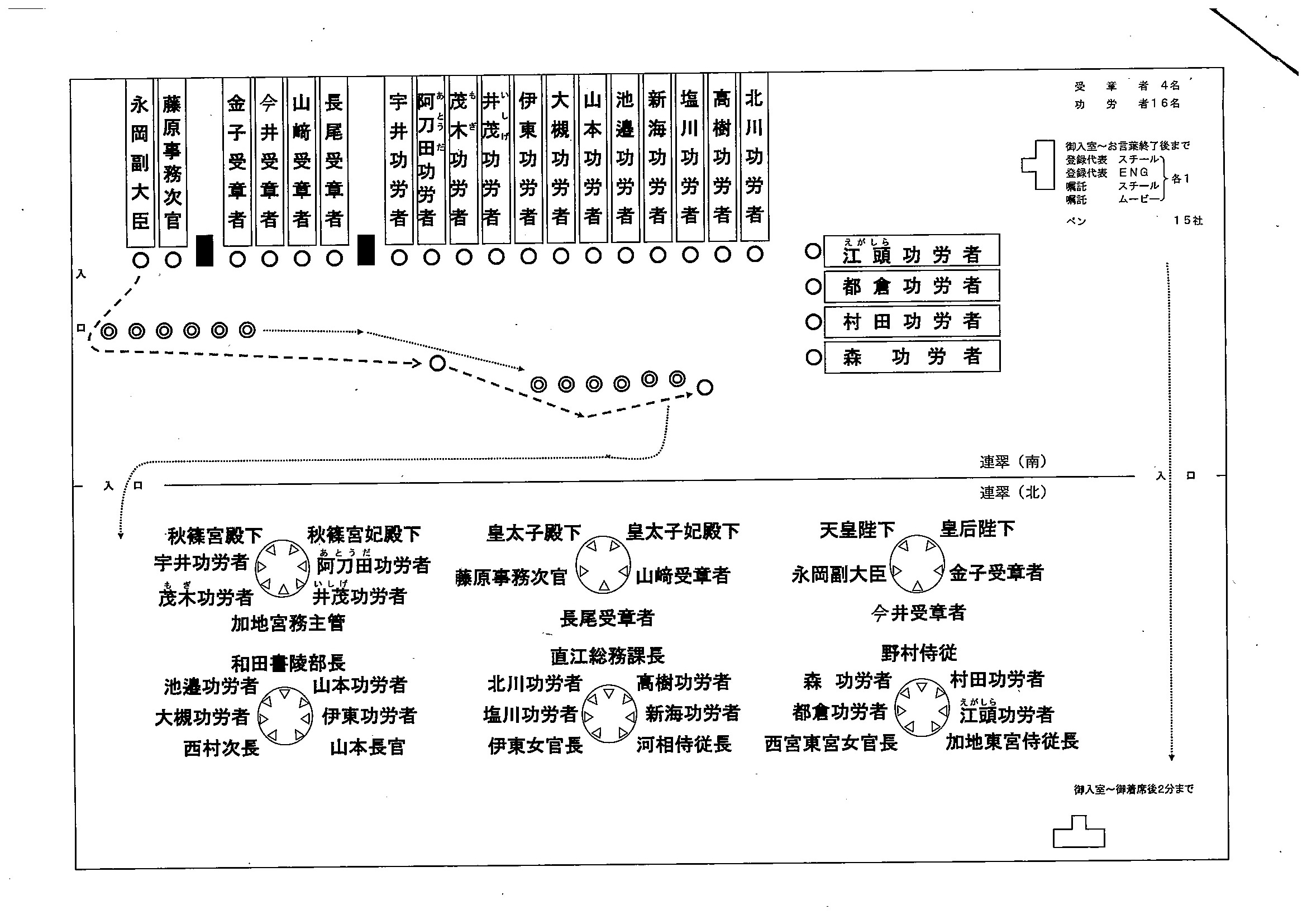 年齢順でテーブルが分かれ、一番若い組は商法の江頭憲治郎先生、作曲家の都倉俊一さん、和食の村田吉弘さんと私の4人でした。お役人の方々が続いたあと、秋篠宮ご夫妻、皇太子殿下妃殿下、天皇陛下皇后陛下がテーブルに来られ、軽いフレンチ料理をいただきながら歓談させていただきました。私は場違い間のある最年少なのでおとなしくしていたのですが、恩賜賞・学士院賞受賞時のお茶会でご説明した私の研究内容を皇后陛下は「不思議なお話でしたね。」と覚えていてくださいました。ありがたいことです。もう,お目にかかることはできないのでしょうか。
