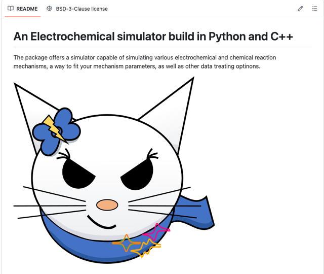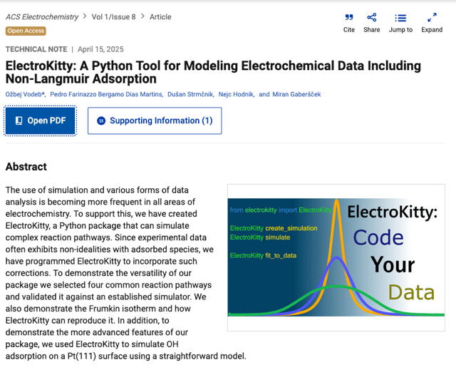 だいぶ前に「電気化学のシミュレーション:Pythonを使ってみる」という記事を書きました。そこで紹介したコードは、シミュレーションの雰囲気をつかむには十分ですが、研究現場で使うとなると、コードの正当性が査読論文の形で公開されているパッケージを使いたいところです。探してみたら、見つかりました! 今年の4月に公開された論文です。"ElectroKitty: A Python Tool for Modeling Electrochemical Data Including Non-Langmuir Adsorption", O. Vodeb, P. F. B. D. Martins, D. Strmčnik, N. Hodnik, M. Gaberšček, ACS Electrochemistry 2025, 1, 1540-1544. https://doi.org/10.1021/acselectrochem.4c00218
